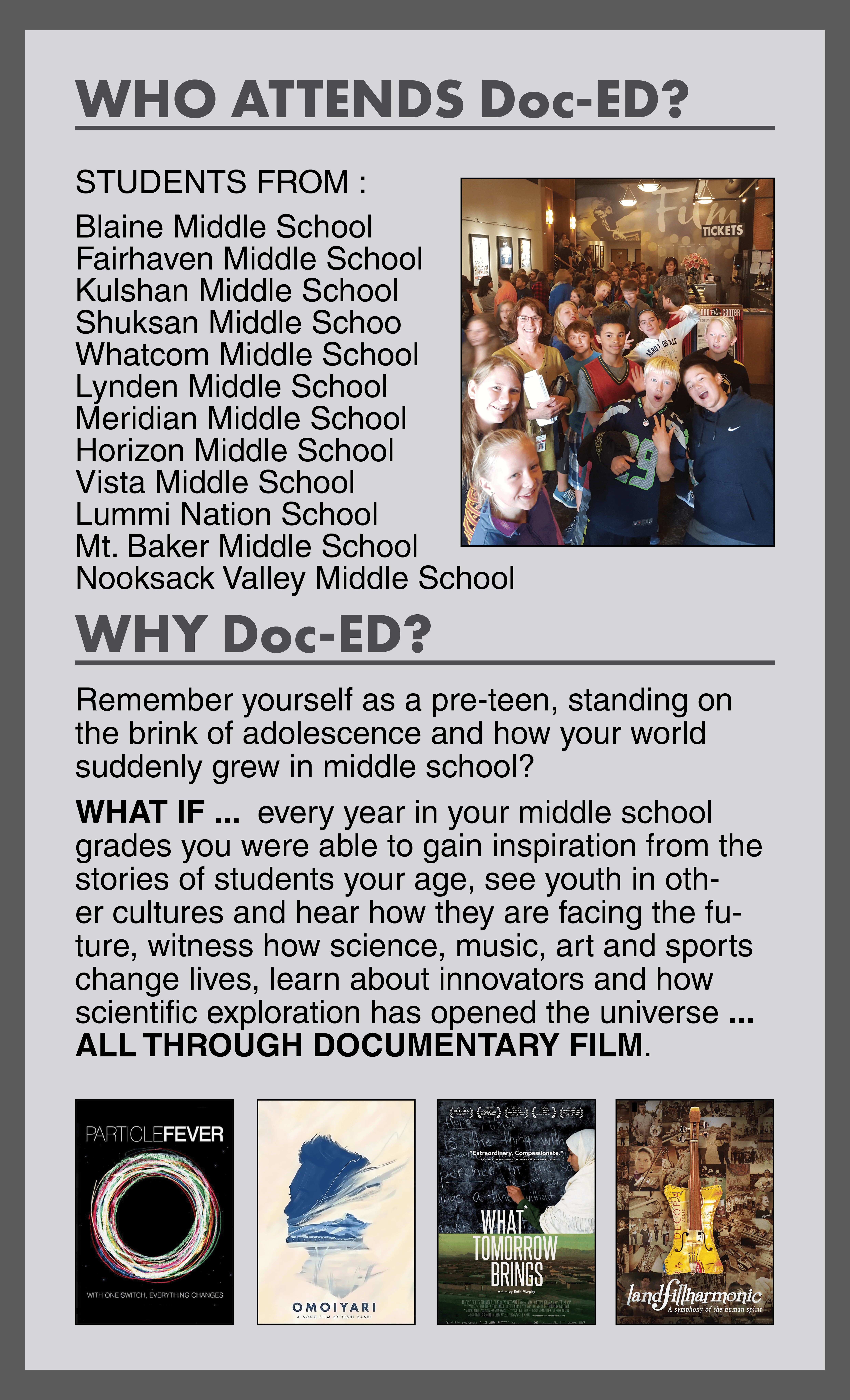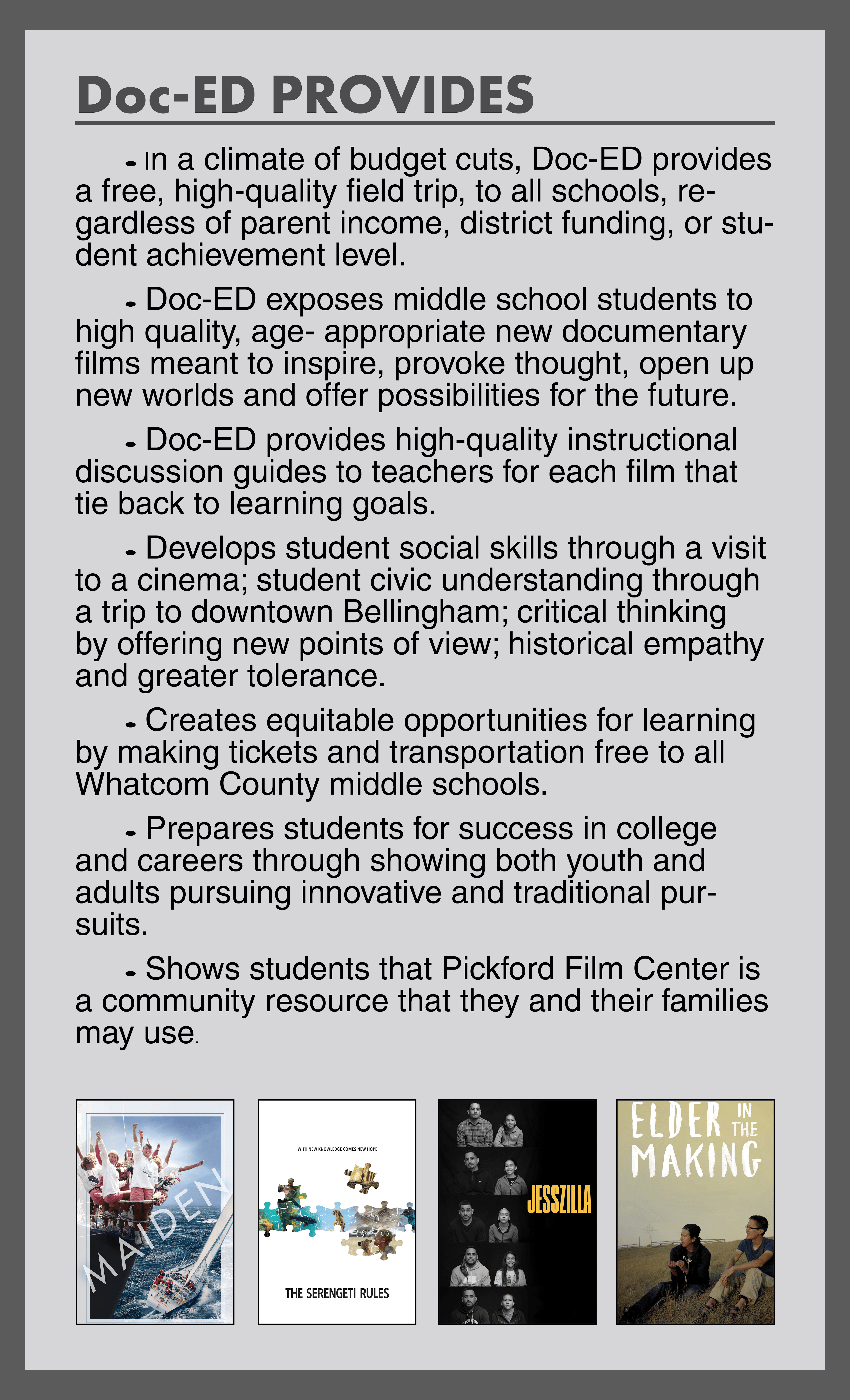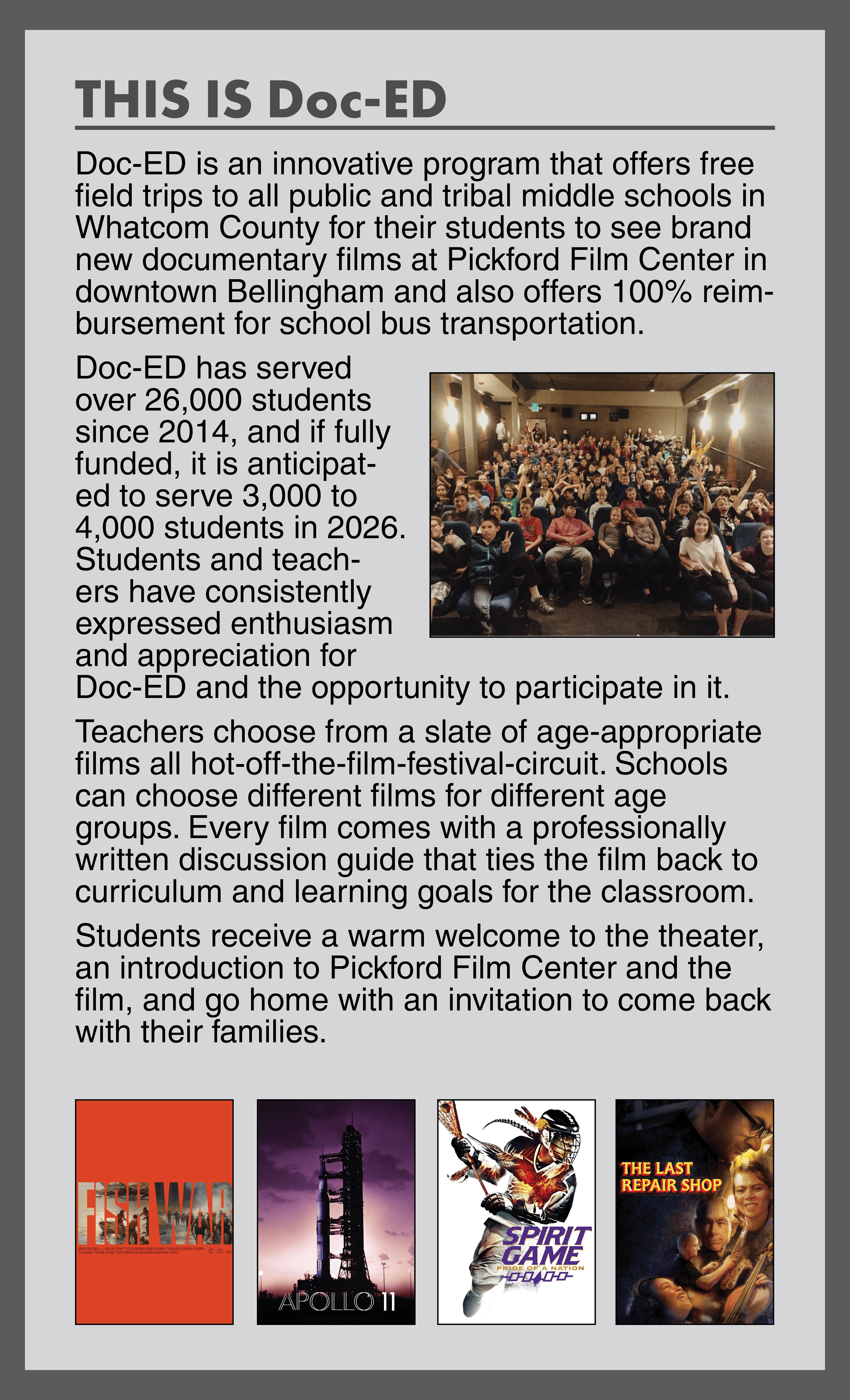 Doc-ED has been an integral part of PFC's Doctober since 2014. Pickford Film Center offers free tickets and bus transportation to all public and tribal middle schools in Whatcom County to come to our cinema for a specially created, age-appropriate documentary program.